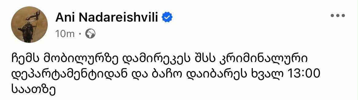 ჩემს მობილურზე დამირეკეს შსს კრიმინალური დეპარტამენტიდან და ბაჩო დაიბარეს ხვალ 13:00 საათზე - ანი დანარეიშვილი