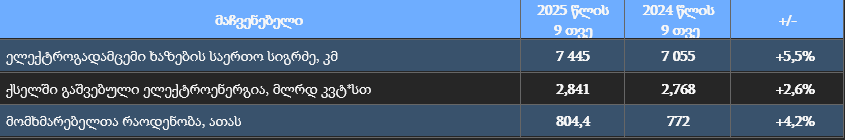 2025 წლის 9 თვის მონაცემებით კომპანიის ელექტროგადამცემი ხაზების საერთო სიგრძემ 7 445 კმ შეადგინა, რაც 5,5%-ით (390 კმ-ით) აღემატება 2024 წლის 9 თვის მაჩვენებელს (7 055 კმ). კომპანიის ელექტროგადამცემი ხაზების საერთო სიგრძე ქსელის განვითარების, რეკონსტრუქციის და მოდერნიზების სამუშაოების ჩატარების შედეგად გაიზარდა.