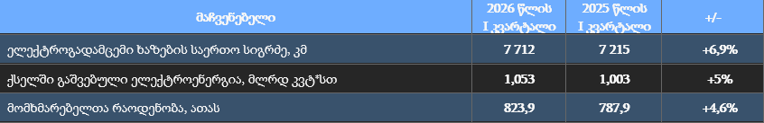 2026 წლის იანვარ-მარტის მონაცემებით კომპანიის ელექტროგადამცემი ხაზების საერთო სიგრძემ 7 712კმ შეადგინა, რაც 6,9%-ით (497 კმ-ით) აღემატება 2025 წლის იანვარ-მარტის მაჩვენებელს (7 215 კმ). კომპანიის ელექტროგადამცემი ხაზების საერთო სიგრძე ქსელის განვითარების, რეკონსტრუქციისა და მოდერნიზების სამუშაოების ჩატარების შედეგად გაიზარდა.
