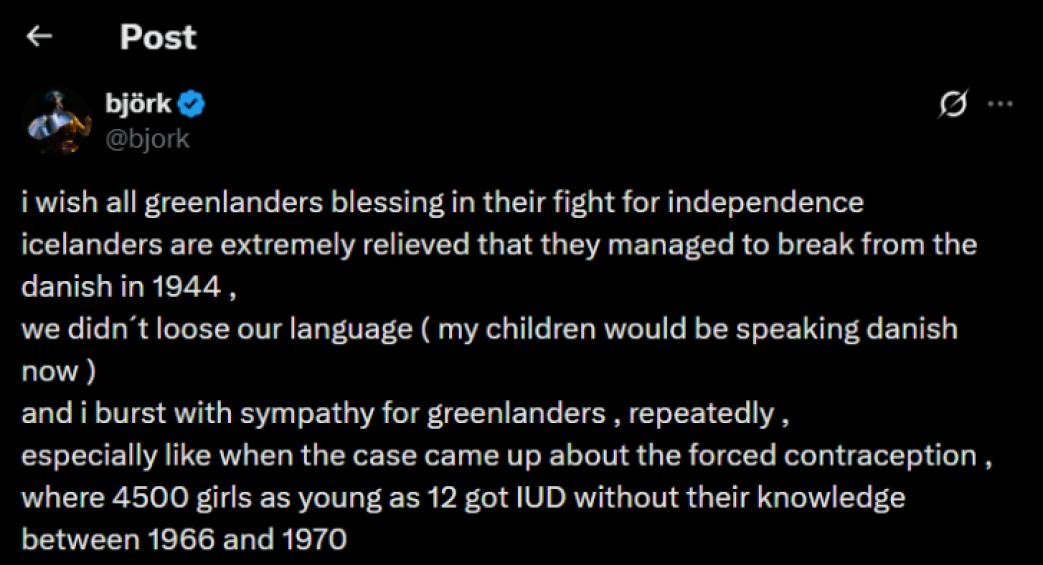 ბიორკი: ყველა გრენლანდიელს ვუსურვებ წარმატებას დამოუკიდებლობისთვის ბრძოლაში - დანიელები გრენლანდიელებს დღესაც ისე ექცევიან, თითქოს მეორეხარისხოვანი ადამიანები იყვნენ, აუტანელია იმის წარმოდგენაც კი, რომ ისინი ერთი სასტიკი კოლონიზატორის ხელიდან მეორის ხელში აღმოჩნდნენ