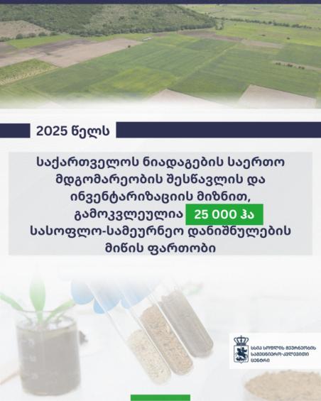 საქართველოს ნიადაგების საერთო მდგომარეობის შესწავლის და ინვენტარიზაციის მიზნით, 2025 წელს გამოკვლეულია 25 000 ჰა სასოფლო-სამეურნეო დანიშნულების ფართობი